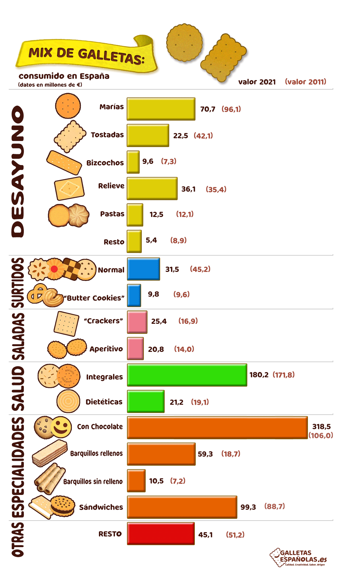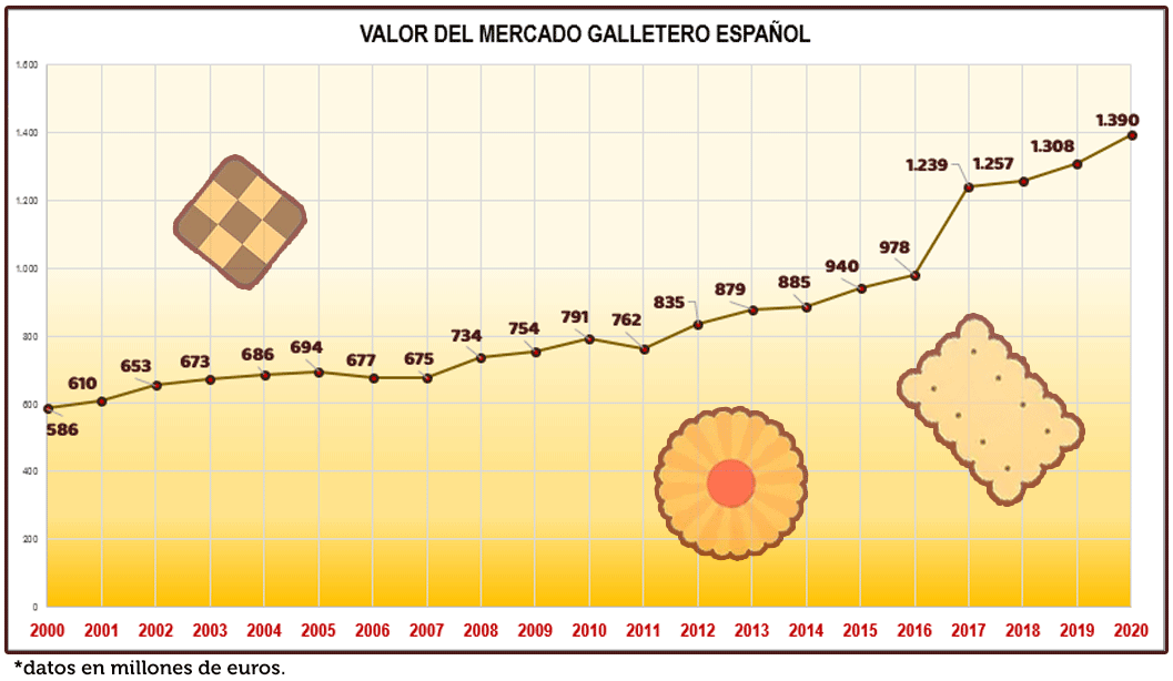 El mercado español de galletas sigue creciendo año a año, situándose en 2020 en 1.390 millones de euros (con un crecimiento del 6,2% con respecto al año anterior).